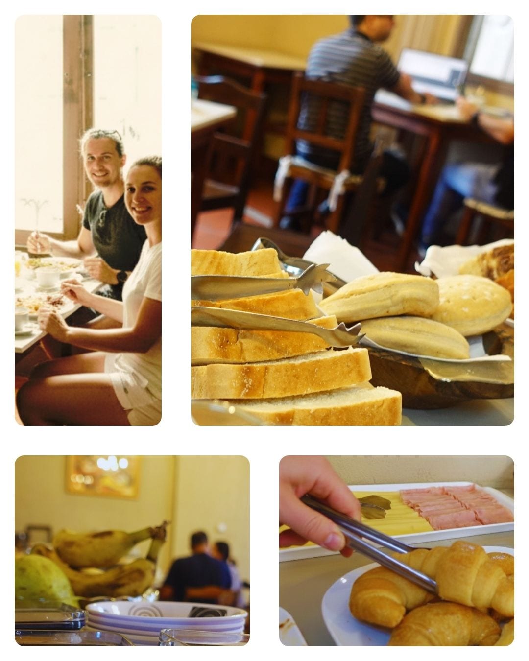 We offer scrambled eggs, bruschetta, a variety of herbal teas, coffee, coffee with milk, yogurts, natural juices, fresh fruit, croissants, tarts, puddings, homemade breads, cheese, cold cuts, spreads, cereals, etc.